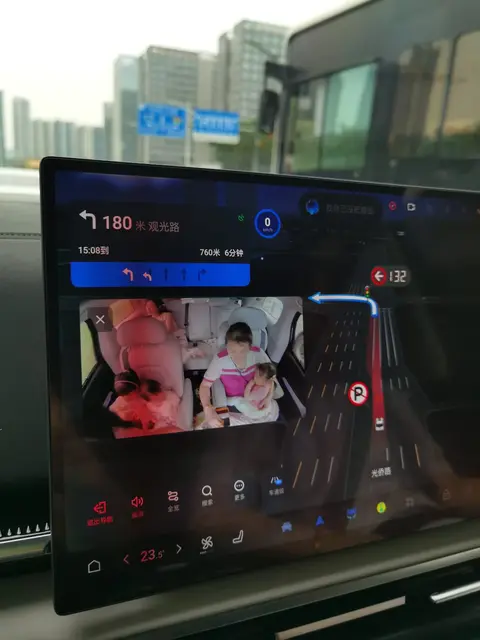 注意看这里出现了一个屏幕,这个是后排宝宝守护功能。在之前的版本当中,这个屏幕它是不可以挪动的,而且也没有办法单独打开,然后出现在别的画面的上。现在我可以一边导航,一边打开这个后排宝宝守护功能,而且你会发现这个画面是有变动的,在整个屏幕当中,我可以任意的把它挪到我想要的位置,既不影响导航,也不影响我随时关注自己的宝宝,这也算是一个比较大的突破吧。