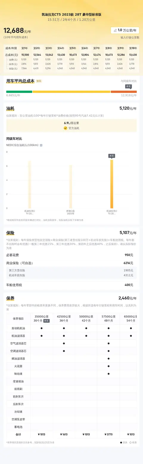 据估算,同级车的最低用车成本是12709元/年,最高是16278元/年,凯迪拉克CT5 2023款 28T 豪华型标准版是13363元/年,整体不算低。