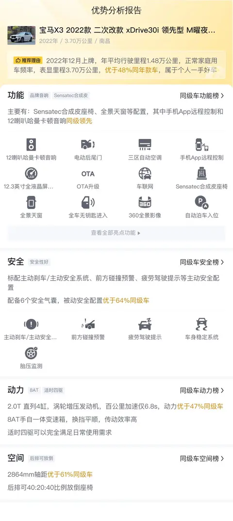 当前这款二手宝马X3的市场行情,考虑到其车龄较短和较低的里程数,这辆车的售价较为合理。预估再行驶2年后,如车况维持良好,仍可售得约19万元,保值率还不错。