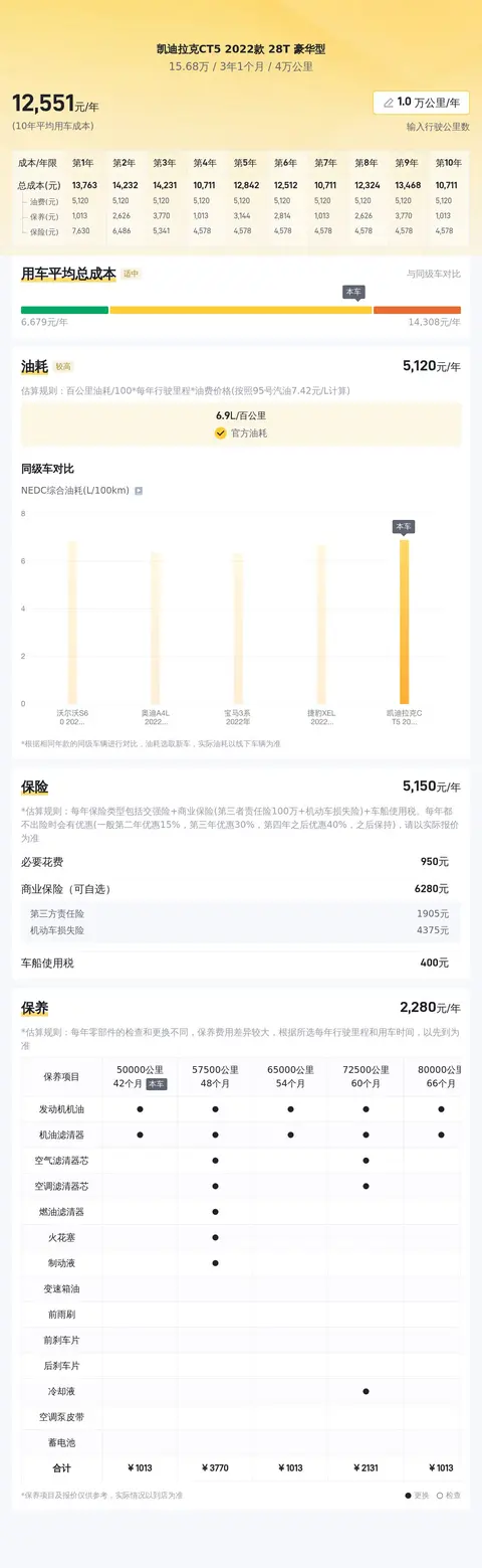 基于懂车帝对凯迪拉克 CT5 2022 款 28T 豪华型的分析,预计其未来 6 年内的平均用车成本约为 13,346 元/年,这在同级别车型中处于适中的水平。其中,油费、保养费、保险费以及可能出现的其他费用,都是车主需要考虑的因素。值得一提的是,凯迪拉克 CT5 2022 款 28T 豪华型的保险费用约为 5,536 元/年,这一费用在同类车型中相对较高。车主可以通过合理的驾驶习惯和定期维护,降低用车成本。总体而言,凯迪拉克 CT5 2022 款 28T 豪华型的用车成本相对合理,但对于预算有限的车主来说,仍需谨慎考虑各项费用。