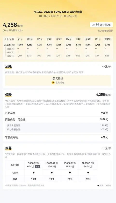 根据当前的市场行情,这款宝马X1的二手车价格区间大致在16.05万元至19.21万元之间。作为一款豪华品牌车型,它的保值率表现相对较高。在用车成本方面,按照每年2万公里的行驶里程计算,包括油费、保险费和保养费在内,平均每年的用车成本约为20864元。这一成本在同级别车型中属于合理范围,但对于普通家庭来说,仍需考虑自身的经济承受能力。