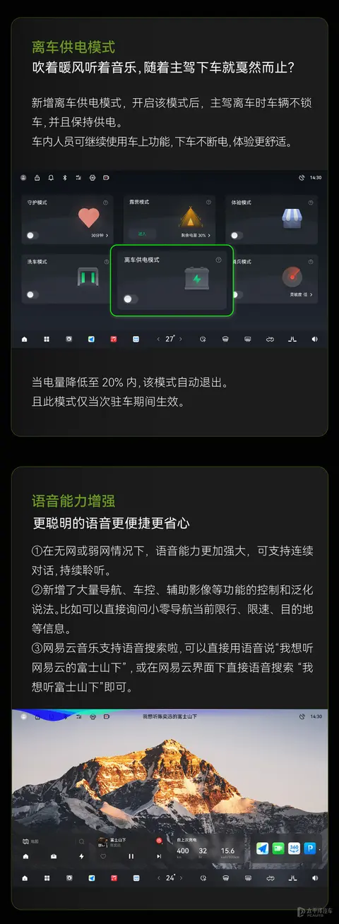 新车升级离车供电模式,开启该模式后,主驾离车时车辆不锁车,并且保持供电。车内人员可继续使用车上功能,下车不断电,体验更舒适。此外,新车语音能力增强,在无网或弱网情况下,语音能力更加强大,可支持连续对话,持续聆听;新增了大量导航、车控、辅助影像等功能的控制和泛化说法。