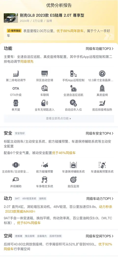 总结:这辆二手别克GL8 2023款 ES陆尊 2.0T 尊享型以其卓越的舒适性和宽敞的空间,特别适合追求高品质生活的家庭。尽管在科技感和燃油经济性方面可能与某些更新潮、更节能的竞品有所差距,但其丰富的配置和合理的价格使其在性价比方面表现出色。如果您正在寻找一辆既能提供舒适乘坐体验,又能满足家庭出行各种需求的MPV,那么这辆二手别克GL8绝对是一个值得考虑的选择。需要注意的是,这辆车目前没有检测报告,建议在购买前务必亲自查看车辆实际情况,确保车况良好。