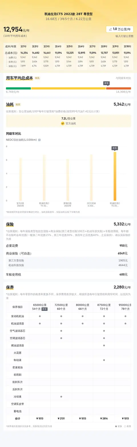 在用车经济性方面,这辆二手凯迪拉克CT5 2022款 28T 尊贵型的表现同样出色。官方给出的百公里油耗为7.2升(NEDC标准),这在同级别车型中属于较低的水平。同时,它还采用了多项节能技术,如启停系统和能量回收系统,进一步降低了燃油消耗。按照每年行驶2万公里、95号汽油7.85元/L计算,这辆车每年的油费约为12456元。虽然相对于一些小型车和纯电动车型来说,这个数字不算很低,但考虑到其豪华轿车的定位和动力性能,这样的油耗表现还是相当不错的。此外,根据预估数据,这辆车在接下来的两年内,市场价值将相对平稳,这也为车主提供了一个稳定的资产保值预期。