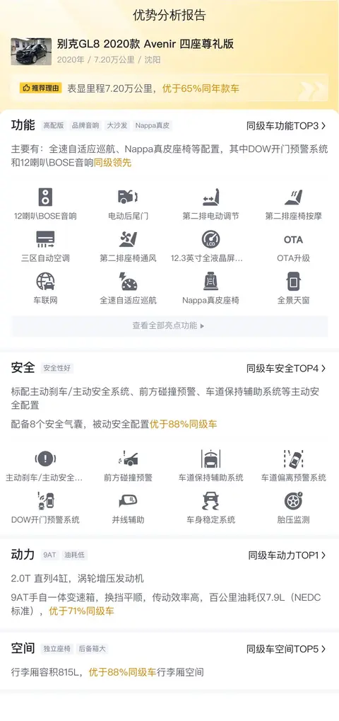 功能配置分析方面,别克GL8 2020款 Avenir 四座尊礼版在安全配置、动力配置、舒适配置以及智能互联方面均有出色表现,特别是在安全配置方面,该车配备了多项主动安全技术,为乘客提供了全方位的安全保障。