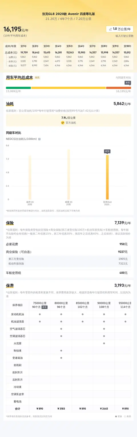 用车成本方面,懂车帝大数据平台通过综合分析大量车主的实际用车情况,我们可以得出一个大致的范围,别克GL8 2020款 Avenir 四座尊礼版每年的用车成本大约在15908元左右,这一数据为全国车主平均用车成本,具体用车成本根据车主实际使用情况而定。