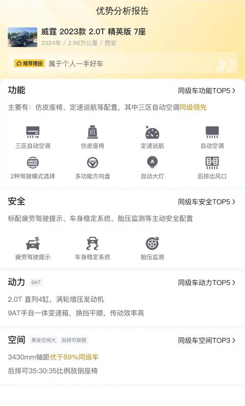 综上所述的新车含税价、用车成本、市场行情、优势分析、同款比价等数据仅供参考。在配置部分,因为二手车非标品,车辆可能会存在配置改装的情况,具体车况信息需要线下结合车辆实际情况进行综合参考。