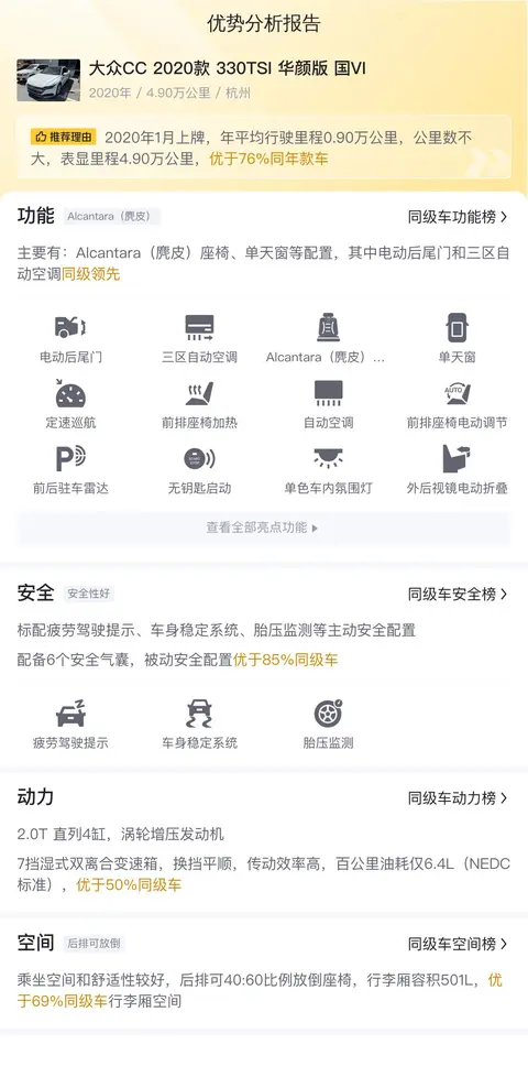 据估算,同级车的最低用车成本是6506元/年,最高是13783元/年,大众CC 2020款 330TSI 华颜版 国VI是11333元/年,所以不算低。