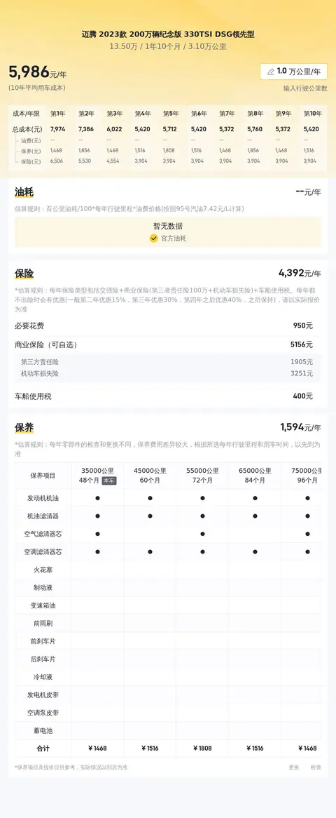 另外,迈腾 2023款 200万辆纪念版 330TSI DSG领先型,10年平均用车成本是6669元/年,而同级车的最低10年平均用车成本是6103元/年,最高是11462元/年,所以用车成本偏低。