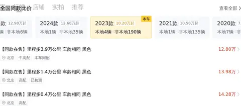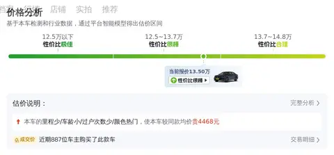 包括里程、车龄、过户次数、颜色四个方面的因素会影响价格,这辆车少于均值0.9万公里,加价2000元,车龄少于均值0.3年,加价2000元,过户次数少于均值0.2次,加价400元,颜色为黑色,加价68元,