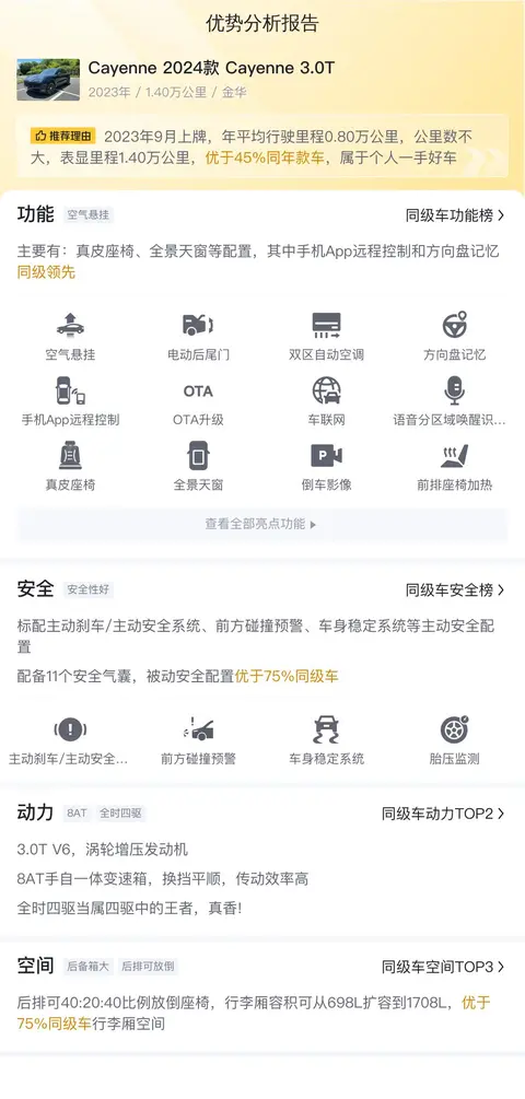 综上所述,这款二手保时捷Cayenne在车况、性能配置、市场行情和用车成本等方面的表现都不错。如果您正在寻找一款豪华SUV作为日常代步或长途旅行之选,那么这辆车无疑是一个值得考虑的选项。