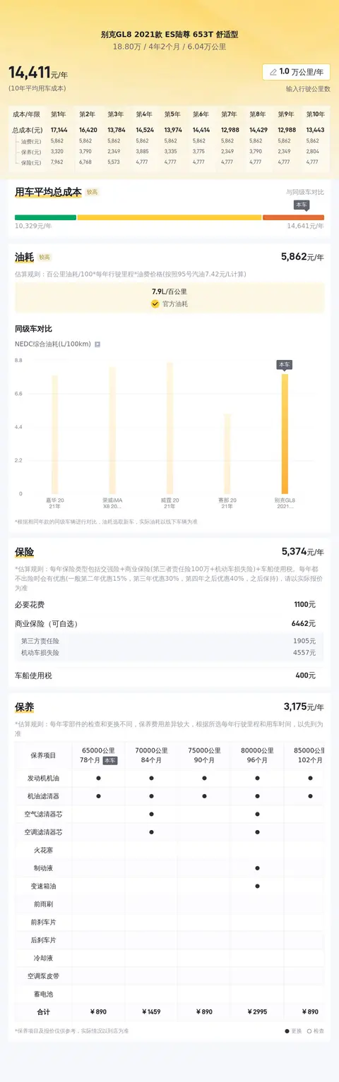 关于用车成本方面,根据懂车帝官方对别克GL8 2021款 ES陆尊 653T 舒适型的大数据分析,得到的结论是:这款车的10年平均用车成本约为14,387元/年。