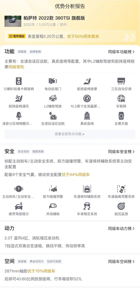 综上所述,这款帕萨特 2022款 380TSI 旗舰版在动力、舒适性和智能配置方面表现出色,是一款值得推荐的中型轿车。该车目前售价为12.28万元,相较于新车含税价优惠15.38万元,且首付门槛较低,是一种不错的购车选择。年度用车总成本约12490元,具体费用要看用车频率及使用环境而定。车况信息显示,该车有过一次过户记录,行驶里程为5.2万公里,符合国六排放标准。如果您正在寻找一款中型轿车,不妨考虑一下这款帕萨特。