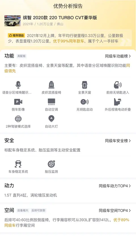 该车具体版本为——2020款缤智220 TURBO CVT豪华版,地点在佛山,上牌日期2021年12月,表显里程1.2万公里,白色车身深色内饰,新车指导价15.98万,二手车报价10.38万,过户次数0次。支持分期购车,首付3.11万即可开回家。