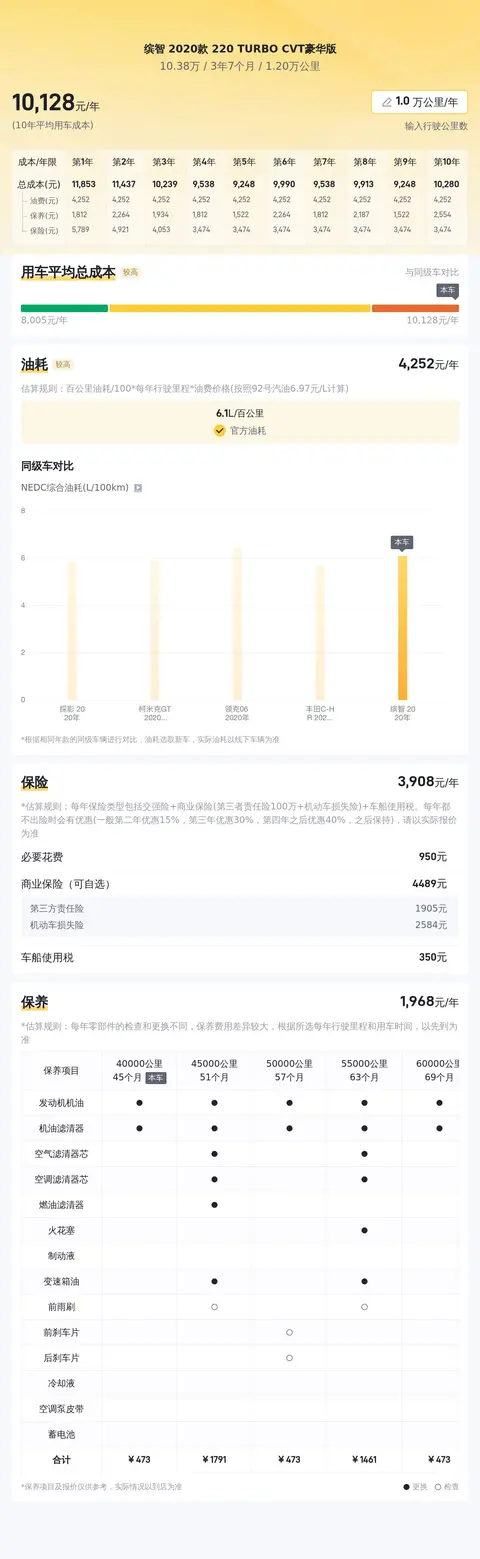 经过懂车帝的综合测算,该车的10年平均用车成本约为10,407元/年,与同级别车相比处于适中的水平,具体的费用如下图所示,仅供参考。