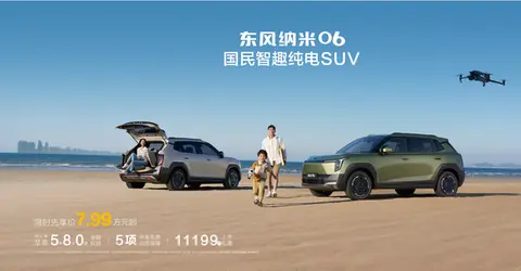 在7-10万级纯电SUV市场,东风纳米06(图片|配置|询价)以7.99万元起的限时先享价,具备较强的价格竞争力,另外该车配置非常丰富,入门就给到了天元智舱、百万级路虎揽胜同款天地门,全系标配直流/交流快慢充接口、对外放电以及L2级智能驾驶辅助等功能,整车的性价比可谓是相当的高。背靠东风汽车56年央企造车底蕴与高等级安全标准,纳米06(逛导购)在技术实力、品质管控和售后服务上拥有天然的可信赖基因,堪称“国民优选座驾”。