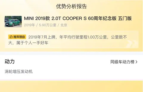 这辆MINI 2019款 2.0T COOPER S 60周年纪念版 五门版,现在在北京售卖,2019年7月首次上牌,行驶里程5.9万公里,个人一手车。这车的新车指导价是30.18万,现在二手报价16.8万,比新车含税价优惠了16.09万。看着这价格,心里是不是已经开始盘算买车的事儿了?别急,咱接着往下看。