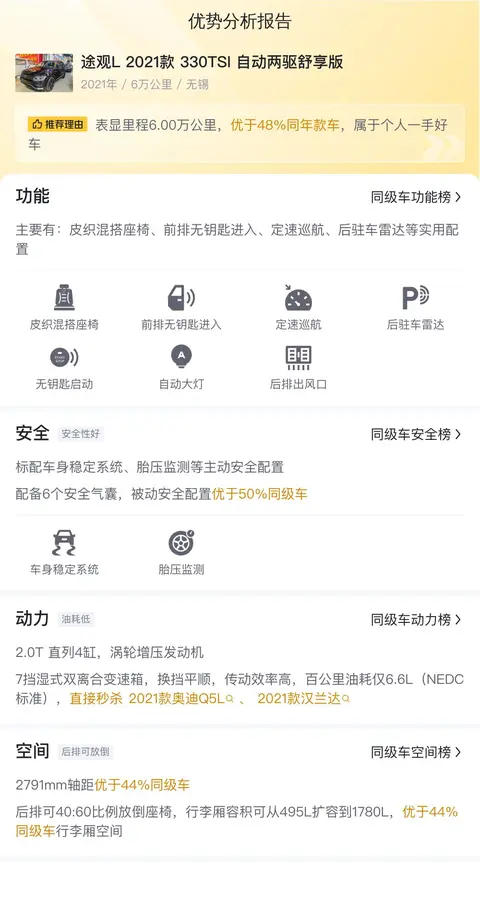 上汽大众途观自2010年在国内上市以来,一直是大众SUV家族中的明星车型。途观L是途观的长轴距版本,专为满足中国消费者对更大乘坐空间的需求。2021款途观L于2020年10月13日正式上市,作为中期改款车型,它在外观、内饰和配置上进行了多项升级,以保持市场竞争力。今天我们就为您带来一辆二手途观L 2021款 330TSI 自动两驱舒享版,接下来让我们一起来看看这辆车的表现如何。