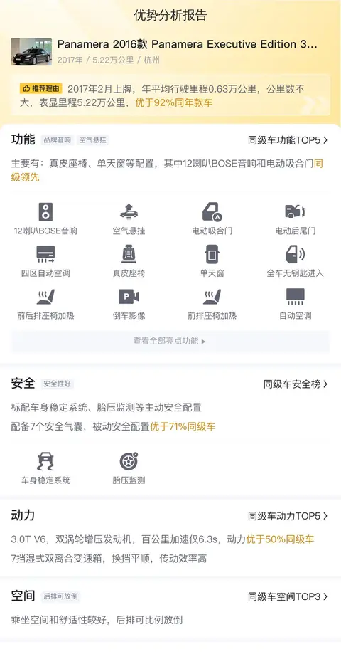 优势:保时捷Panamera的知名度还是不错的,这一款因为年限有点久了,行驶里程却不多,性能也保持的不错,空间宽敞,舒适性也好,配置方面也比较齐全,品牌名气大,保值率高。