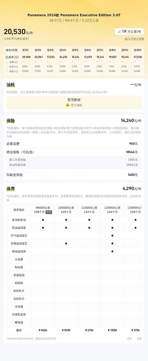 这辆红色的Panamera 2016款 Panamera Executive Edition 3.0T,10年平均用车成本是21739元/年,同级车的最低是10931元/年,最高是47783元/年,所以它的用车成本不算低。