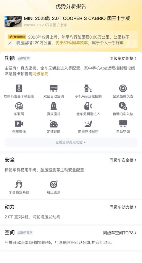 据估算,这辆二手MINI 2023款 2.0T COOPER S CABRIO 国王十字版的用车成本是11548元/年,原价四十多万的车,这个花费,也正常。