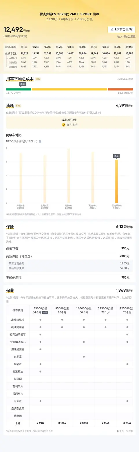 雷克萨斯ES 2020款 260 F SPORT 国VI的10年平均用车成本约为12,588元/年,这一成本在同类车型中处于合理区间。其中,油耗成本较低,主要是因为雷克萨斯ES 2020款 260 F SPORT 国VI采用了高效的发动机技术和轻量化材料,具有较好的燃油经济性。保险费用和保养费用则属于正常范围,提供了必要的车辆保障和维护。总体而言,雷克萨斯ES 2020款 260 F SPORT 国VI的用车成本相对合理,适合追求品质和性价比的消费者。