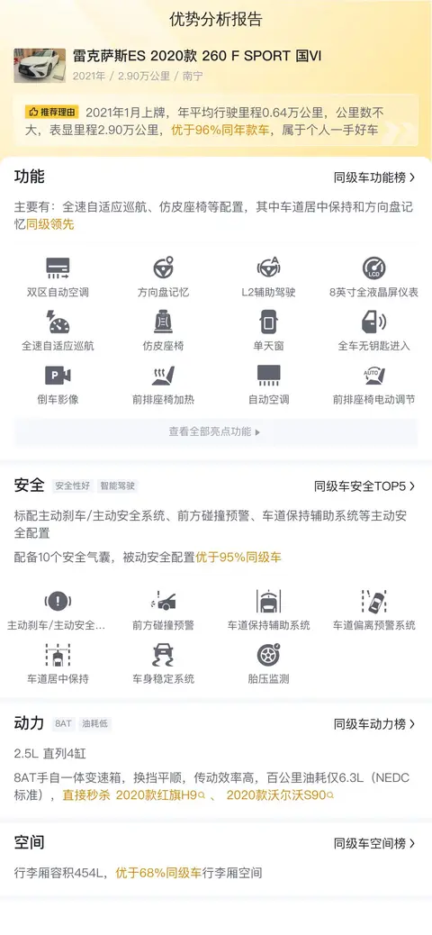 这辆雷克萨斯ES 2020款 260 F SPORT 国VI,属于中型豪华轿车类别,上牌地为南宁,上牌日期2021年1月,表显里程2.9万公里,车身颜色为白色,前驱驱动方式,自动变速器,排量2.5L,国VI排放标准,新车指导价38.60万,目前二手车报价23.98万,至今过户0次。