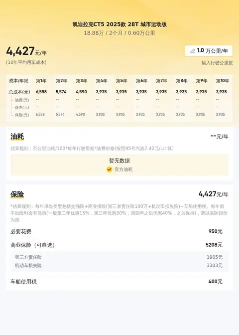 根据相关数据,凯迪拉克CT5 2025款 28T 城市运动版的10年平均用车成本大概是6180元/年,与同级车相比,处于中间值,油耗方面,此车WLTC综合油耗是7.51(L/100km),也处于正常值。