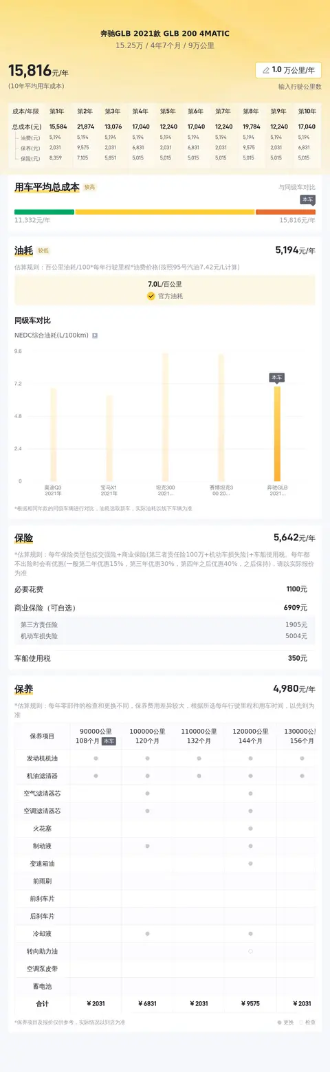 据估算,同级车的最低用车成本是6506元/年,最高是18790元/年,奔驰GLB 2021款 GLB 200 4MATIC是15782元/年,所以用车成本适中。