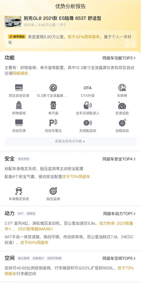 报价相对较高,别克GL8 2021款 ES陆尊 653T 舒适型是2021款中配车,报价是18.5万,同级车的报价普遍在15.59万-20.68万,所以价格不太有优势,但保值率较高。