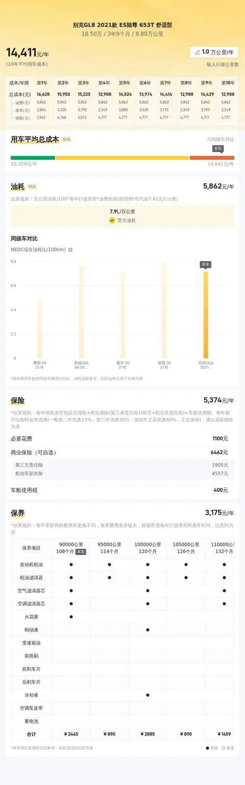 据估算,别克GL8 2021款 ES陆尊 653T 舒适型的用车成本是14521元/年,同级车最低是14521元/年,最高是16868元/年,所以它的用车成本不算低也不算高,是适中的水准。