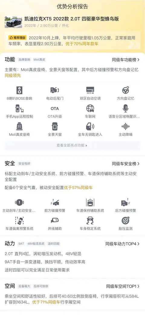 综上所述的新车含税价、用车成本、市场行情、优势分析、同款比价等数据仅供参考。在配置部分,因为二手车非标品,车辆可能会存在配置改装的情况,具体车况信息需要线下结合车辆实际情况进行综合参考。