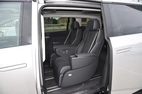 座椅部分采用全粒面头层Nappa真皮座椅,前两排座椅均支持通风、加热、按摩功能,副驾标配“女王座椅”,二排标配零重力座椅。整体乘坐空间宽敞,座椅具备10点/18电按摩功能,座椅靠背和坐垫支持三档通风、加热,标配14向座椅电动调节。并且配备了双50W手机无线快充、折叠桌板、隐藏式杯架等配置。第三排可180°躺平,乘坐空间宽敞,靠背角度和头枕无极电调,3个座椅坐垫及靠背均配备加热功能,且能一键电动收纳,可灵活切换载人载物模式。全家大七座模式下后备箱空间大,切换为超级大四座时,可形成1.8米大床房。此外,该车还具备分辨率达到3k的21.4英寸后排娱乐屏、双温可调的车载冰箱、23扬声器Xopera音响系统2.0、最大功率6kW的对外放电及220V车内电源等配置。