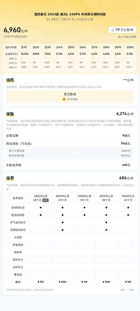 在不考虑其他费用大幅波动的情况下,预估十年平均用车成本大约为每年2.1万元。需要注意的是,这一估算未纳入保险费用,以及燃油消耗成本,后者受市场油价波动和个人驾驶习惯的影响较大。