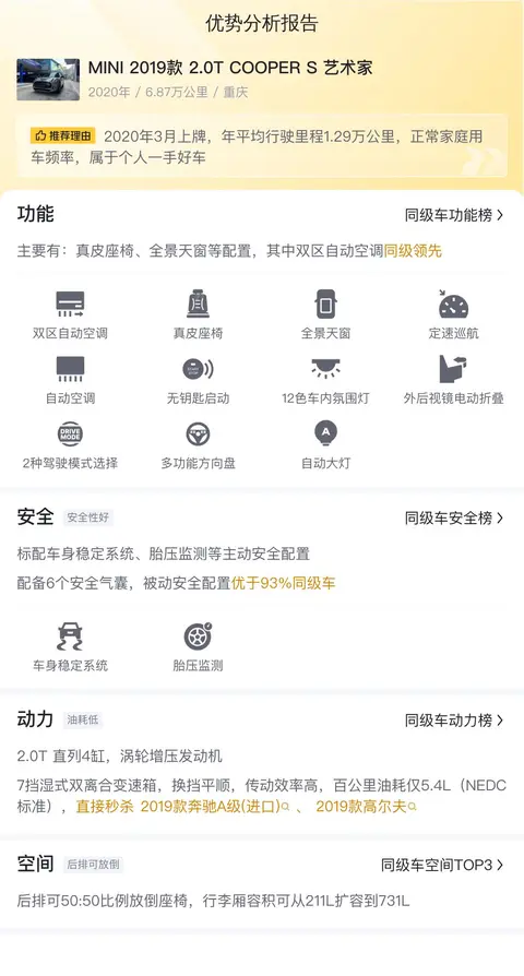 选择哪款车,每个人都有自己的考量。有的人喜欢MINI复古可爱的外观和精致的内饰,也有的人看重MINI良好的操控性和动力表现。还有人注重车辆的性价比和实用性。如果您属于上面说的这种情况,那么二手MINI将是一个不错的选择。首先价格相对新车便宜,其次车辆经过检测,排除事故车、泡水车、火烧车,外观覆盖件有较多的整备修复痕迹,但并不影响日常使用。内饰豪华,空间宽敞,是一款既能满足日常出行需求,又能带来驾驶乐趣的车型。如果您正在寻找一款个性十足的小车,那么这辆二手MINI将是一个不错的选择。
