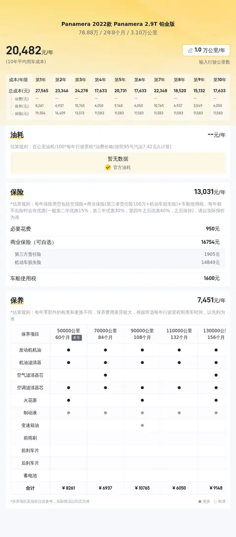 根据当前市场行情,2022款保时捷Panamera的二手车价格区间为68.08万至82.27万,本车价格为78.88万,处于相对较高的水平。考虑到本车是一手车、里程较短且保养良好等因素,在合理范围内。本车10年平均用车成本为21709元/年,相较于同级别车型,用车成本适中。