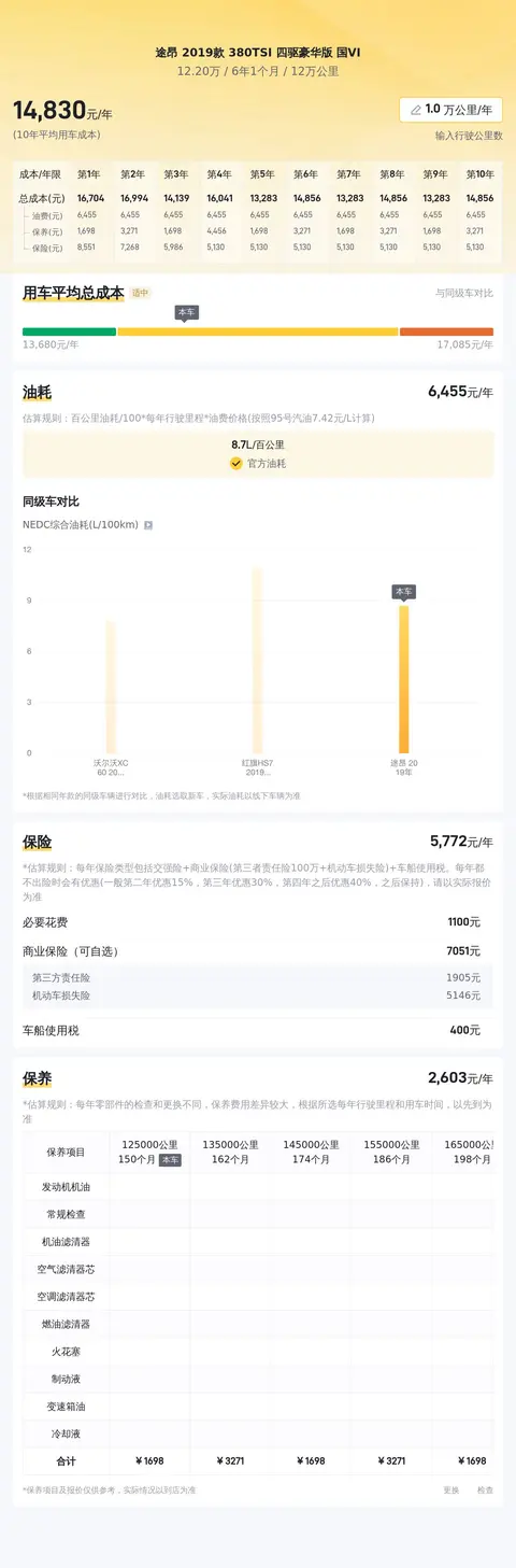 根据懂车帝大数据分析,这辆途昂 2019款 380TSI 四驱豪华版 国VI的市场行情在11.85万至15.05万之间,具体售价因车况而有所不同。这辆车的售价12.2万,车况正常情况下性价比不错。用车成本方面,这辆车的官方百公里油耗为8.7升,按每年行驶一万公里里程计算,燃油费用约为7278元,年度商业保险约4678元,每年保养费用约3038元,平均年度用车总成本约14994元,用车成本与同级别车型相比处于中等偏下水平,经济性表现较好。需要注意的是,以上数据仅作参考,实际用车成本可能会根据用车场景和个人驾驶习惯等因素有所差异。