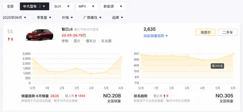 懂车帝6月销量数据显示,智己L6销量为2635辆,位列当月中大型车销量榜单第14位。智己L6竞品车型包括小米SU7(指导价21.59万元起)、小鹏P7+(指导价18.68万元起)、比亚迪汉EV(指导价17.98万元起)等车型。那么从新款智己L6的售价来看,您会在同级别产品中选择谁呢?欢迎在评论区一起聊聊。关于智己品牌的更多消息,懂车帝将持续关注。
