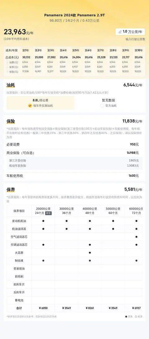 据估算,Panamera 2024款 Panamera 2.9T的用车成本是23670元/年,同级车最低是16898元/年,最高是40938元/年,所以它的用车成本适中。