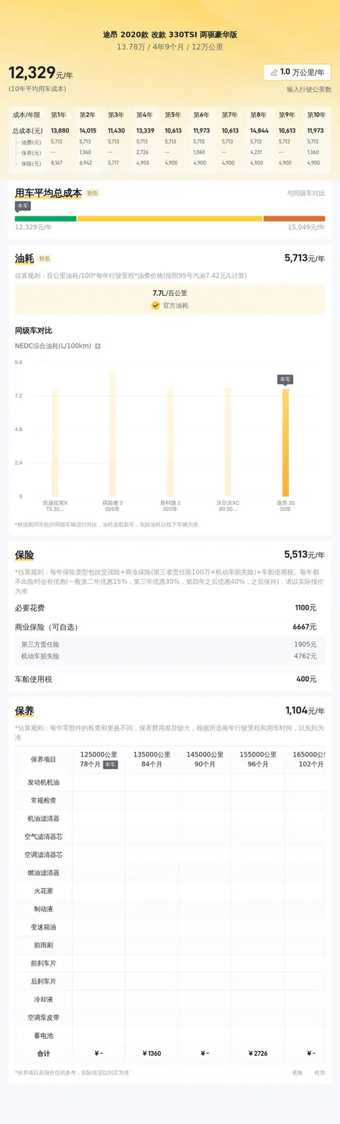 需要注意的是,由于途昂2020款改款330TSI两驱豪华版是一款中大型SUV,其排量和油耗相对较大,因此在使用成本方面可能会高于一些小型或紧凑型车型。此外,作为一款二手车,其车况也会对价格产生重要影响。消费者在购买时应仔细检查车辆的实际状况,确保所购车辆物有所值。