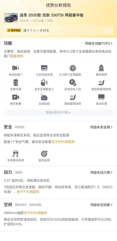 综上所述的新车含税价、用车成本、市场行情、优势分析、同款比价等数据仅供参考。在配置部分,因为二手车非标品,车辆可能会存在配置改装的情况,具体车况信息需要线下结合车辆实际情况进行综合参考。