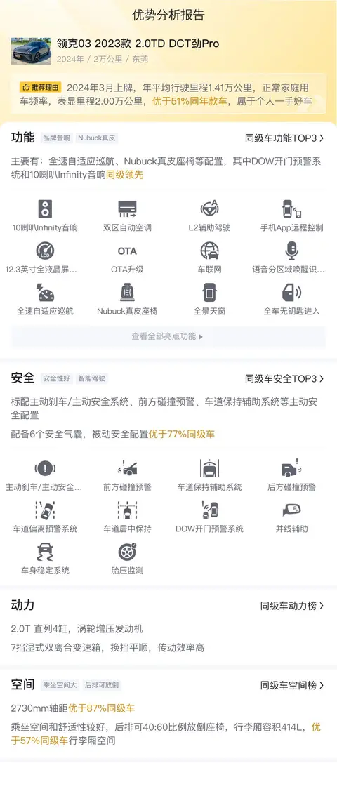 在二手车市场,这辆车的行情大致在8.97万至10.84万之间,而领克03 2023款 2.0TD DCT劲Pro的报价则是10.38万,价格虽然合理,但相对较高。不过,它的保值率较高,因为这款车目前行驶里程数较少。