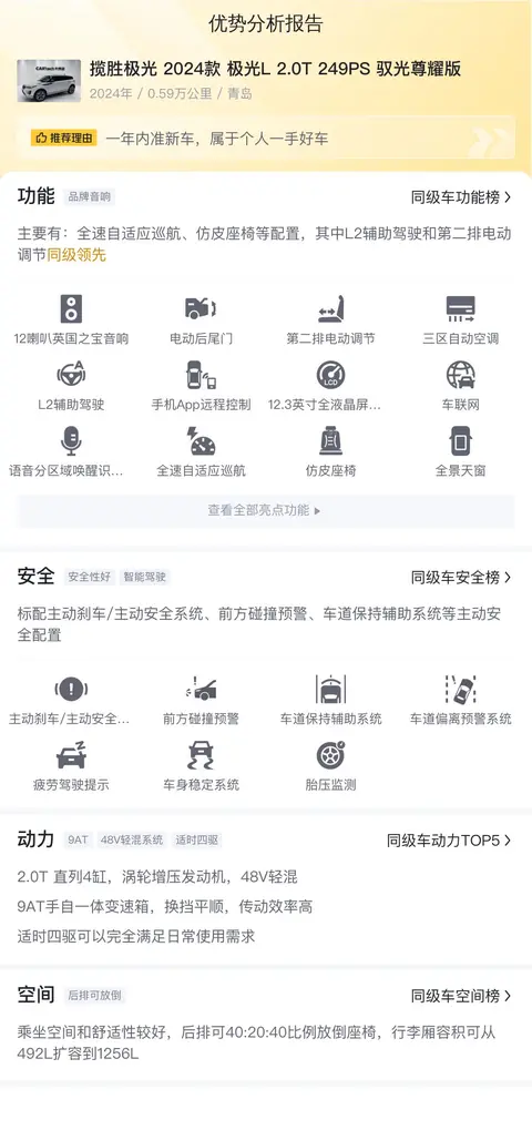 综上所述的新车含税价、用车成本、市场行情、优势分析、同款比价等数据仅供参考。在配置部分,因为二手车非标品,车辆可能会存在配置改装的情况,具体车况信息需要线下结合车辆实际情况进行综合参考。