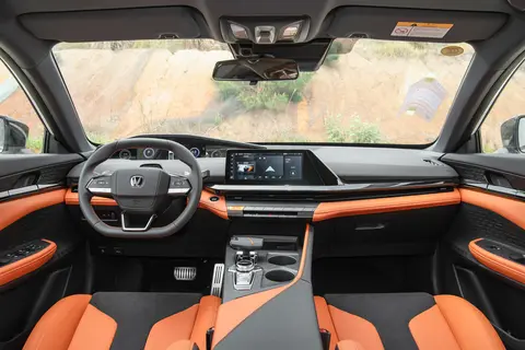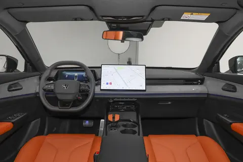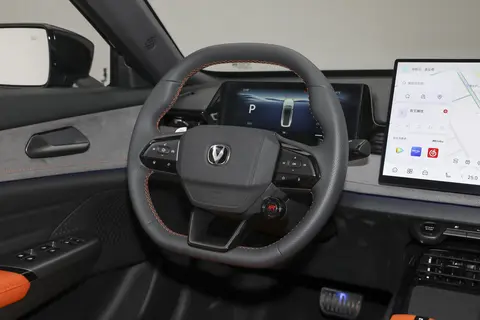 内饰方面,新款长安UNI-V同样采用全新的设计风格,采用时下流行的大尺寸悬浮式中控屏设计,液晶仪表样式也重新设计,副仪表台配有游艇式电子挡把,并保留了部分物理按键。实拍车型内饰采用橙/灰双拼配色,使用橙色缝线/皮质材料进行点缀。此外,方向盘处还配有官方称之为“SUPER RACE 3.0”赛道模式的控制按键,按下该控制按键后,会拥有专属赛道音乐、赛道音效等。