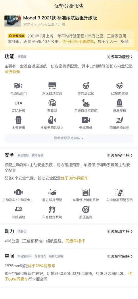 优势方面,这辆 Model 3 首先在动力性能和续航里程上表现出色,为消费者提供了优质的驾驶体验。其次,车辆配置丰富,尤其是 L2 辅助驾驶系统和全速自适应巡航等功能,提升了驾驶的便捷性和安全性。此外,车辆的空间表现也相当出色,既提供了宽敞的乘坐空间,又具备良好的储物能力。