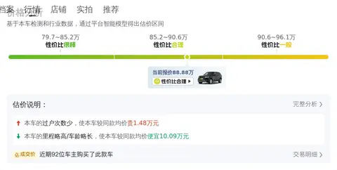 目前的二手车市场,该车型的售价在74.73-93.16万之间,具体售价因车况而有所不同。这台二手车的售价88.88万,车况良好,在同车型中价格处于较高但合理的范围内。年度用车成本方面,按一年行驶一万公里计算,该型车每年燃油、保险及保养的综合用车成本约23503元,具体费用要看用车频率及使用环境而定。
