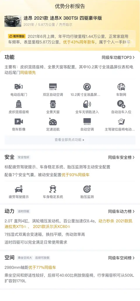 综合来看,这辆二手途昂 2021款 途昂X 380TSI 四驱豪华版各方面表现都还不错,尤其是空间方面,作为一款中大型SUV,无论是家庭出行还是长途旅行,都能提供足够的乘坐和储物空间。在配置方面,如智能互联、舒适座椅等,都能为驾乘者带来良好的体验。同时,其油耗表现也相对合理,适合日常使用。而且报价不高,17.9万的价格让这款车的性价比更高,更值得入手。