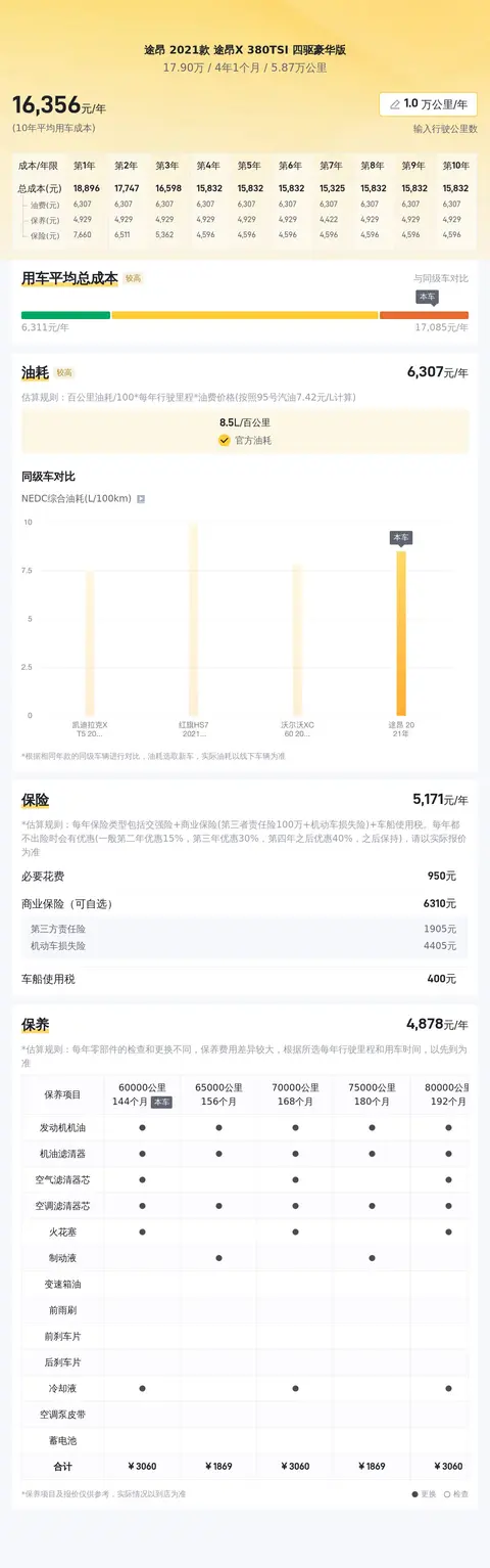 据估算,同级车的最低用车成本是6506元/年,最高是17683元/年,途昂 2021款 途昂X 380TSI 四驱豪华版是15683元/年,所以用车成本较高。