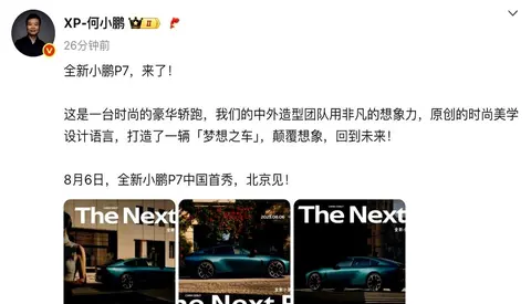 何小鹏8月6日要在北京推出全新P7,车长超5米电机270kW,号称要让豪华品牌不再是首选。