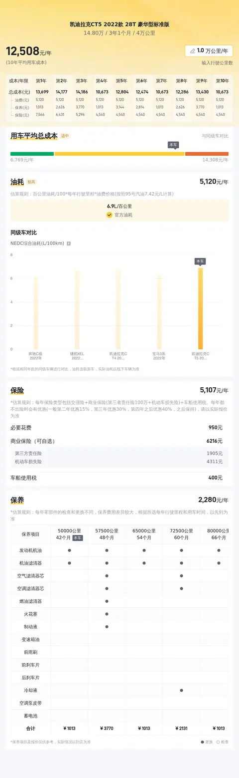 根据懂车帝官方的大数据分析,该车型的百公里油耗为7.76升,按照每年行驶一万公里计算,燃油费用约为6479元,年度商业保险约4727元,每年保养费用约1632元,平均年度用车总成本约12837元,用车成本适中,当然具体用车成本还需要根据车辆的实际使用情况而定。